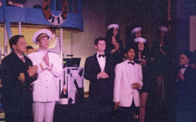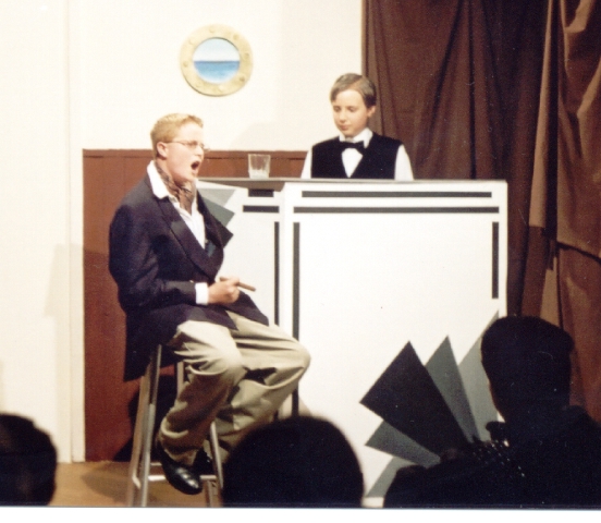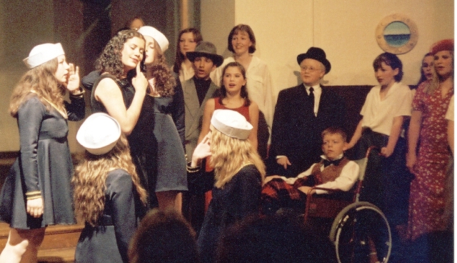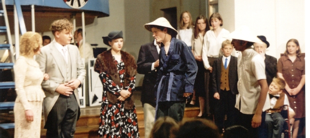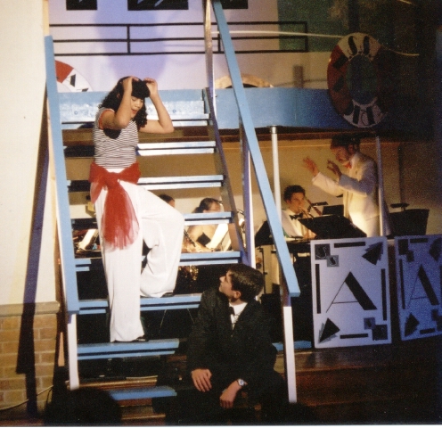 Performed in the Summer of 2002 this is an extremely enjoyable yet demanding performance. In particular the set involved substantial construction as several scenes are set on the upper deck. As we only have a relatively tight performance space it seemed a good idea to situate the band underneath the upper deck. As they are in full view of the audience at all times we made them seem the ship's night club band and dressed them appropriate 30's evening wear.